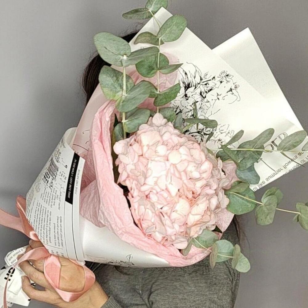 Букет из гортензии с эвкалиптом в стильной упаковке для современной девушки А013 в Макарьеве